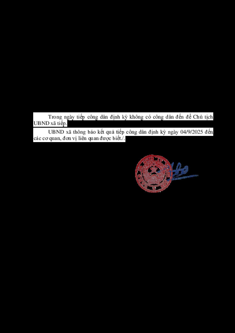 | Tiêu đề văn bản | Thông báo kết luận Tiếp công dân định kỳ ngày 04/9/2025 của Chủ tịch UBND xã | ||
