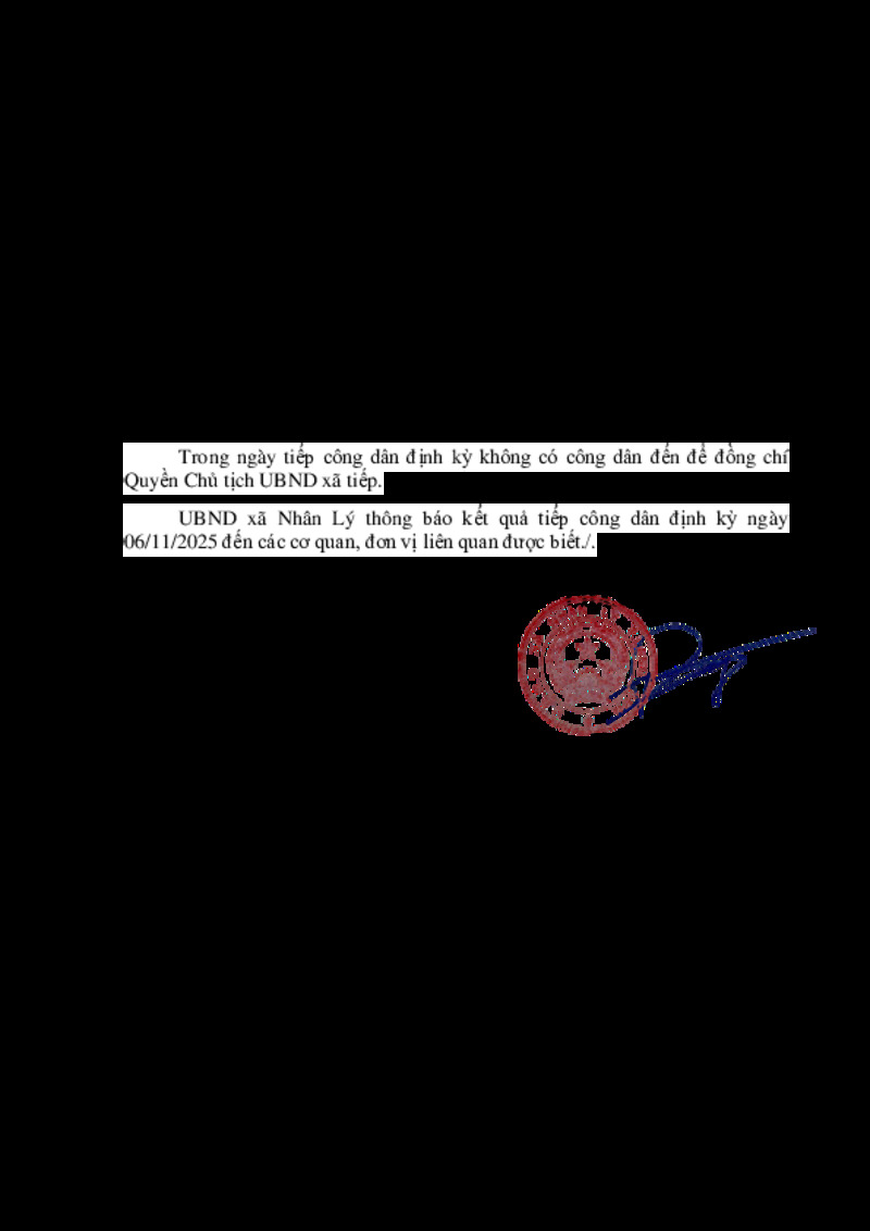 | Tiêu đề văn bản | THÔNG BÁO Kết quả tiếp công dân định kỳ ngày 06/11/2025 của Chủ tịch UBND xã Nhân Lý | ||