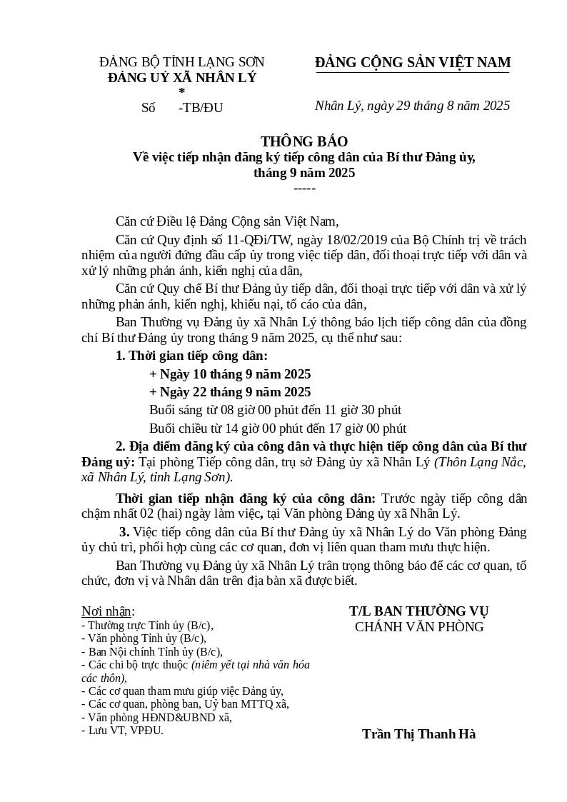 | Tiêu đề văn bản | THÔNG BÁO Về việc tiếp nhận đăng ký tiếp công dân của Bí thư Đảng ủy, tháng 9 năm 2025 | ||