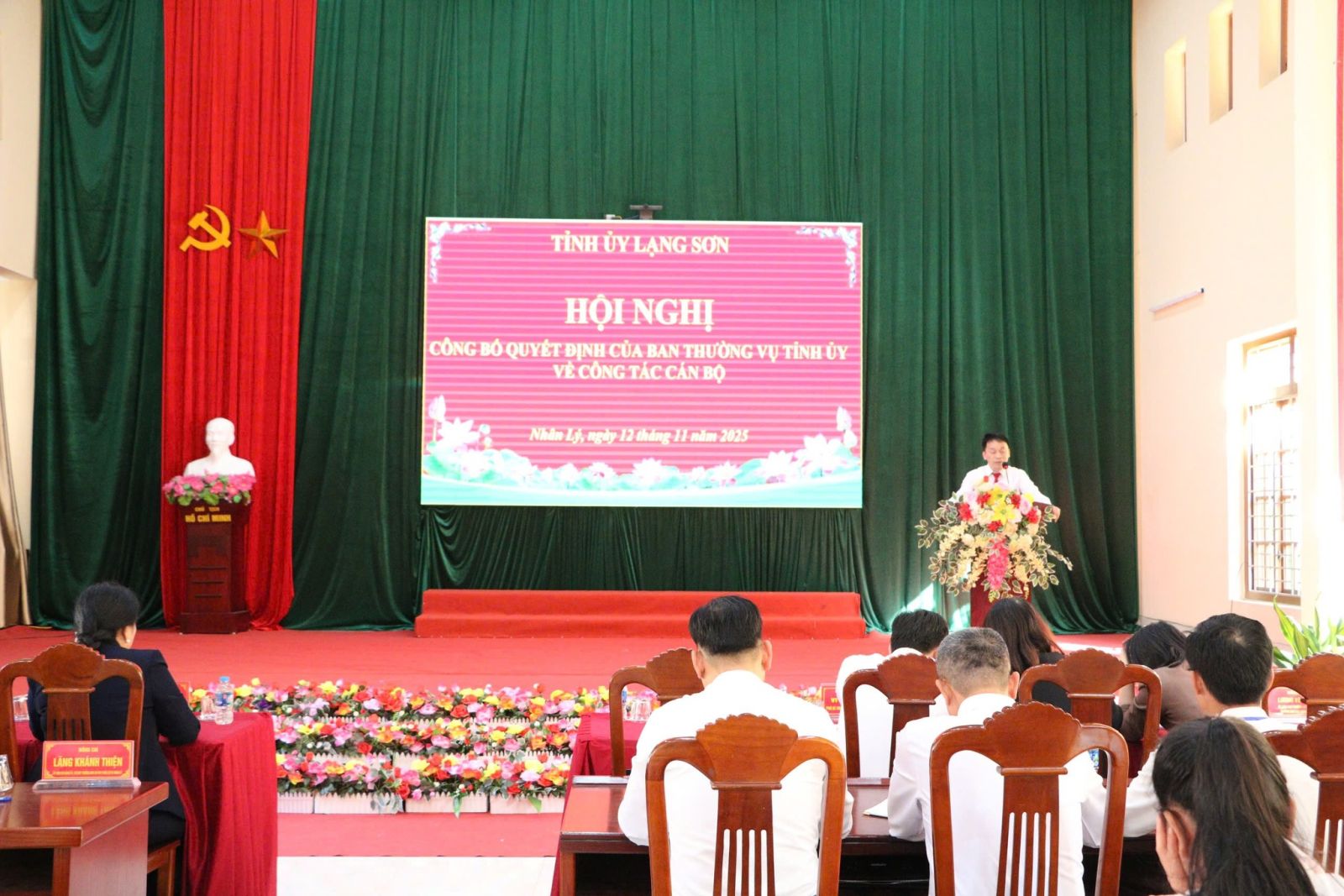Tại hội nghị, đại diện Ban Tổ chức Tỉnh ủy đã công bố Quyết định số 44/QĐ/TU ngày 12/11/2025 của Ban Thường vụ Tỉnh ủy về việc điều động, chỉ định đồng chí Vương Văn Sơn, Ủy viên Ban Chấp hành Đảng bộ, Phó Chủ tịch UBND xã Bằng Mạc tham gia Ban Chấp hành, Ban Thường vụ, giữ chức Phó Bí thư Đảng ủy xã Nhân Lý từ ngày 12/11/2025 và giới thiệu bầu giữ chức vụ Chủ tịch UBND xã Nhân Lý.