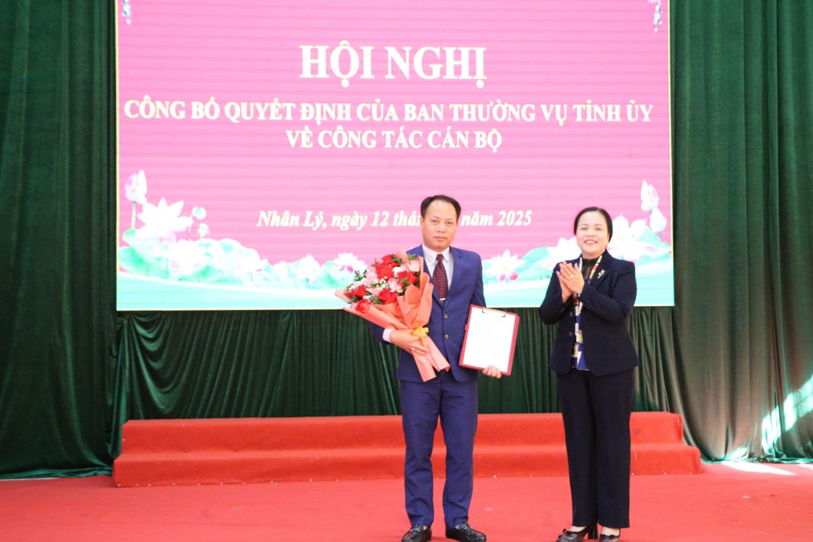 Ngày 12/11/2025, Ban Tổ chức Tỉnh ủy phối hợp với Đảng ủy xã Nhân Lý tổ chức hội nghị công bố quyết định của Ban Thường vụ Tỉnh ủy về công tác cán bộ. Dự hội nghị có đồng chí Giáp Thị Bắc, Ủy viên Ban Thường vụ Tỉnh ủy, Trưởng Ban Tổ chức Tỉnh ủy.