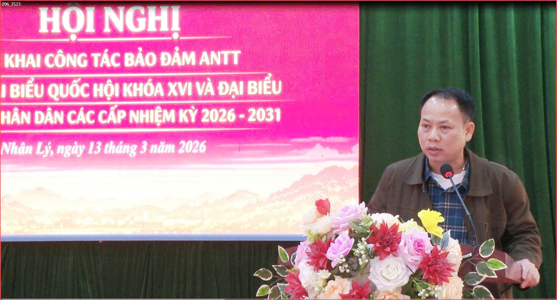 Sáng ngày 13/3/2026, tại Nhà văn hóa xã Nhân Lý, Công an xã Nhân Lý tham mưu UBND xã tổ chức Hội nghị triển khai công tác đảm bảo an ninh trật tự (ANTT) phục vụ bầu cử đại biểu Quốc hội khóa XVI và đại biểu HĐND các cấp nhiệm kỳ 2026–2031. Dự và chỉ đạo hội nghị có đồng chí Vương Văn Sơn – Chủ tịch UBND xã, Chủ tịch Ủy ban bầu cử xã, cùng sự tham dự của lãnh đạo xã, các ban ngành, đoàn thể và lực lượng liên quan.