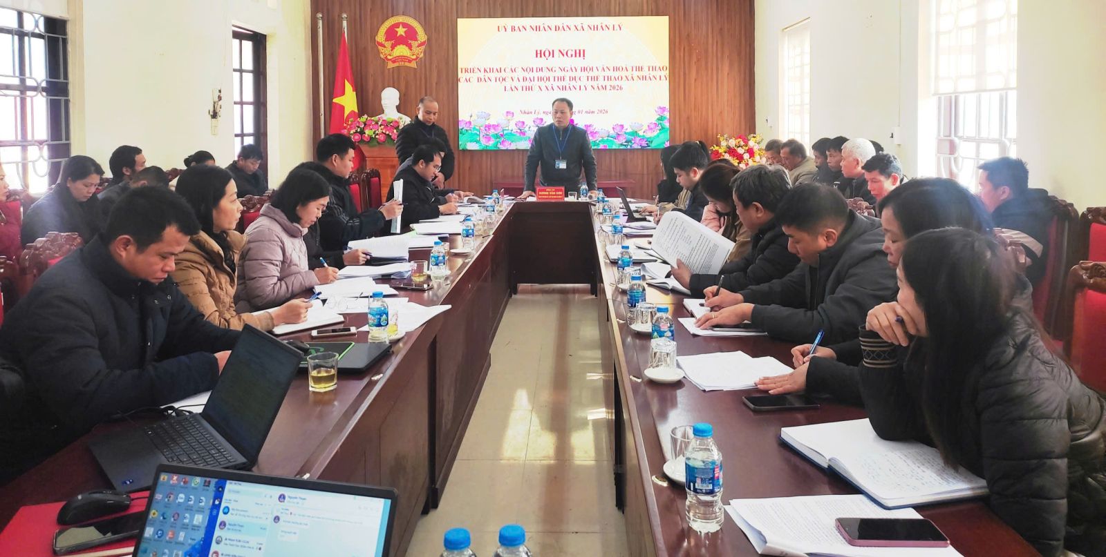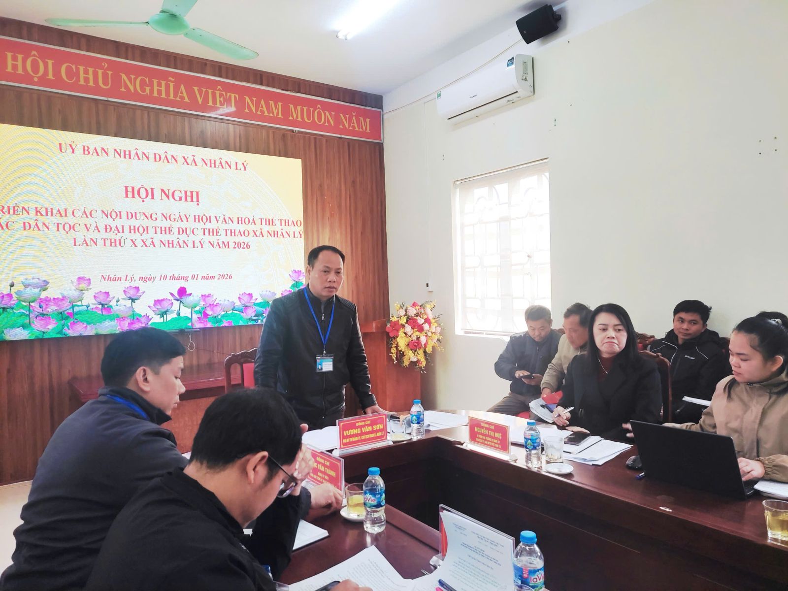 Sáng ngày 10/01/2026, UBND xã Nhân Lý tổ chức hội nghị triển khai các nội dung chuẩn bị Ngày hội Văn hóa – Thể thao các dân tộc và Đại hội Thể dục thể thao xã Nhân Lý lần thứ X năm 2026. Dự và chỉ đạo hội nghị có đồng chí Vương Văn Sơn, Chủ tịch UBND xã. Tham dự hội nghị còn có đại diện các ban, ngành, đoàn thể xã; lãnh đạo, cán bộ các trường học trên địa bàn xã; Công an xã, Ban Chỉ huy Quân sự xã; trưởng các thôn và các thành phần liên quan.