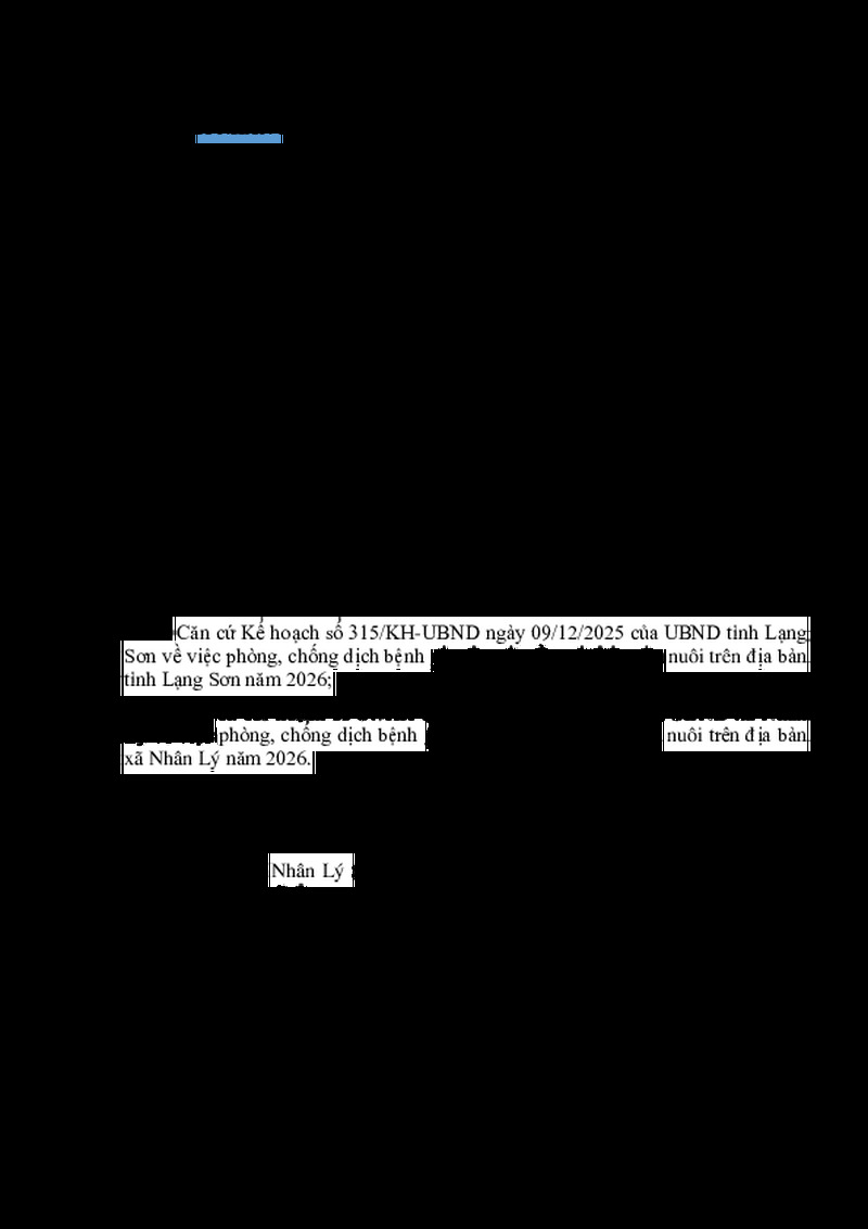 | Tiêu đề văn bản | Kế hoạch Tiêm phòng vắc xin cho đàn gia súc, gia cầm trên địa bàn xã Nhân Lý năm 2026 | ||